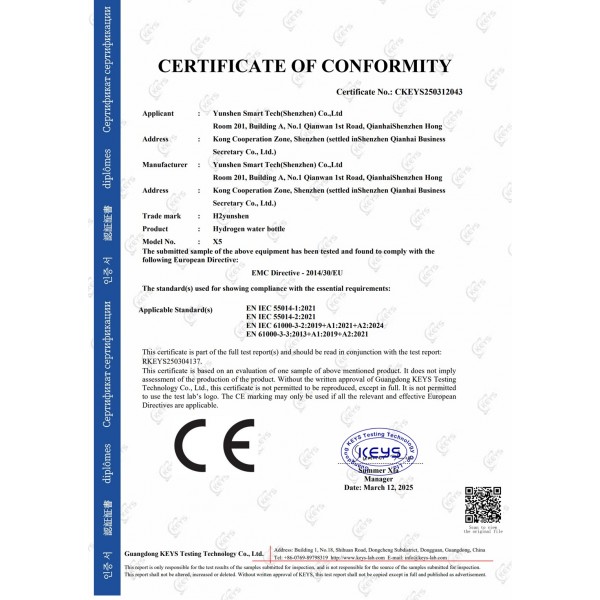 Generatore di bottiglia acqua idrogenata H2yunshen X5 Acquista Bevanda salutare Effetto Certificazione IHSA Recensioni del vincitore del test sulle Borraccia d'acqua idrogenata Certificato SGS senza PFAS Heavy metal non dannoso Per il mercato italiano